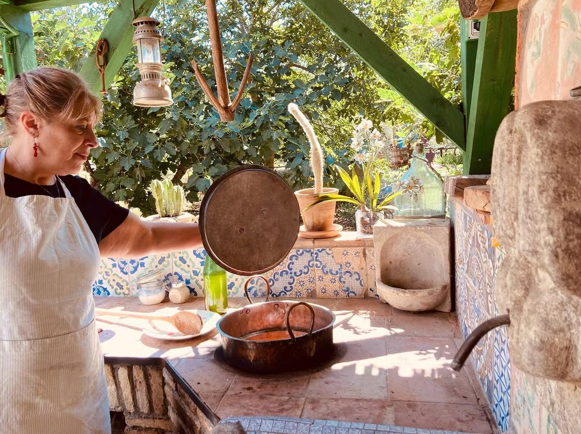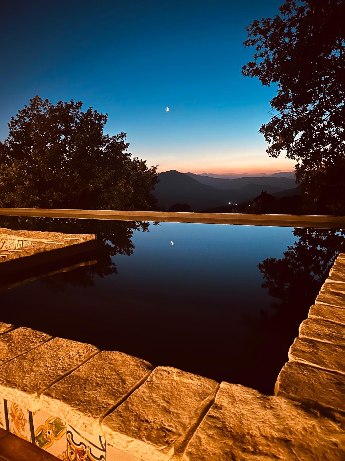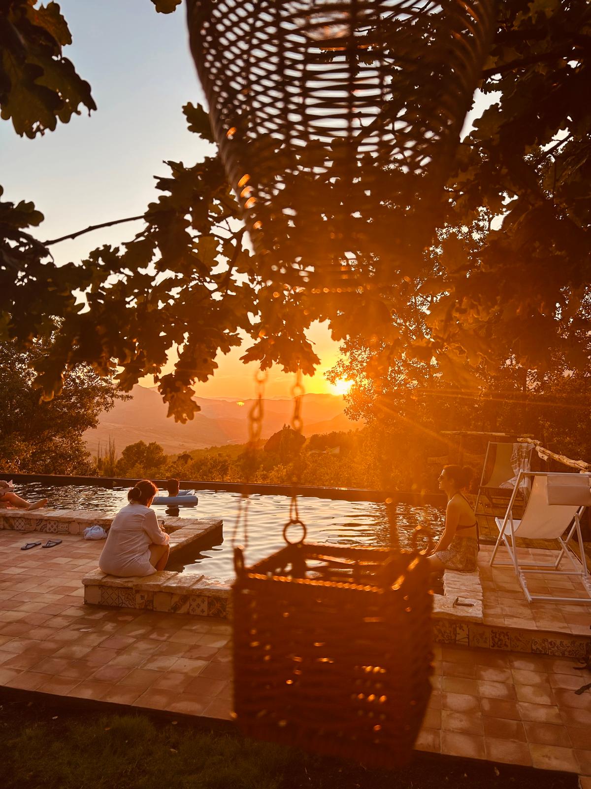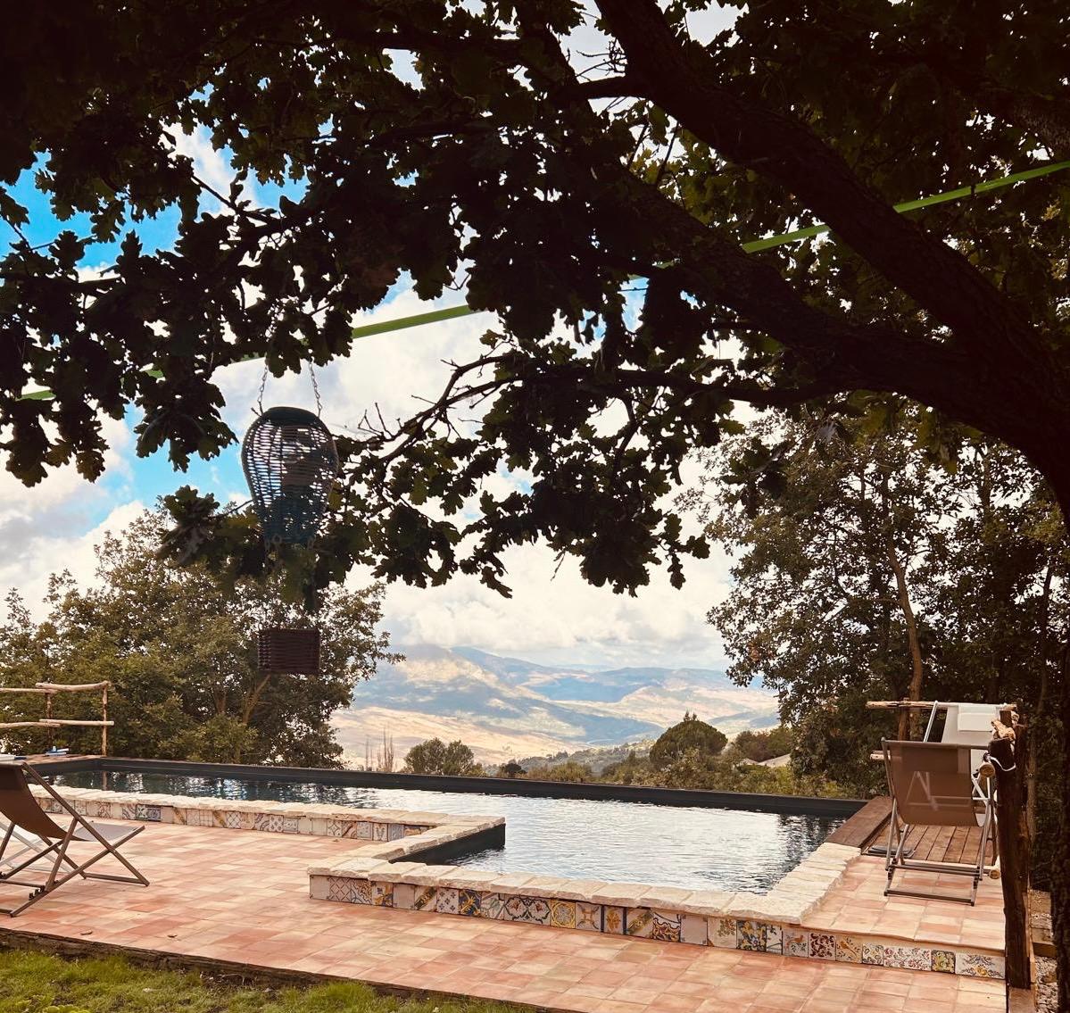 The handcrafted structure, constructed from natural materials and wood, blends seamlessly with the surrounding environment. It overlooks a panoramic valley, offering breathtaking views both in the morning, when the valley awakens, and in the evening, when the sunset reflects its golden light on the pool.